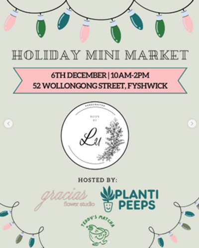 Come and join in the fun and support some amazing small businesses at a Holiday Mini Market event. Hosts Planti Peeps, Gracias Flower Studio, and Teddy's Matcha are joined by Body by Lu, French Rose Studios, TheGirlWhoKnots, and Petal & Pots.